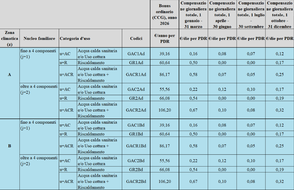 - Gli importi previsti sono differenziati rispetto alla categoria d’uso associata alla fornitura di gas, alla zona climatica di appartenenza del punto di fornitura e al numero di componenti della famiglia anagrafica (persone legate da vincoli di matrimonio, parentela, affinità, adozione, tutela o da vincoli affettivi, coabitanti ed aventi la medesima residenza).
